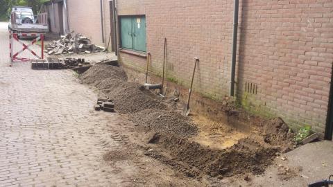 Opnieuw opbouwen van de ondergrond, ± 40cm uitgraven, 25cm gebroken puin aanbrengen en verdichten, 15cm vulzand aanbregen en verdichten, en weer bestraten met bestaande stenen.