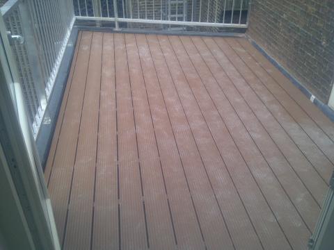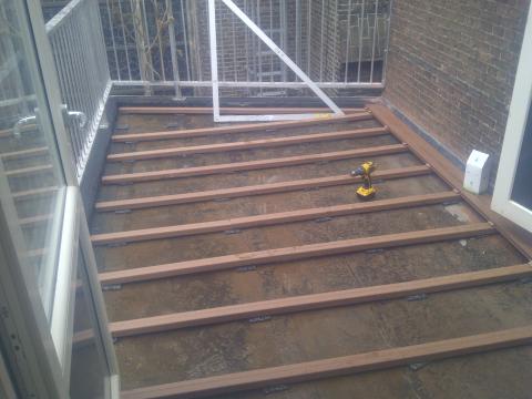 Het maken van composiet vlonder (kunststof) ,UPM Profi Deck. Het plaatsen van liggers op kunststofmatjes en dan de planken bevestigen met t-clips.